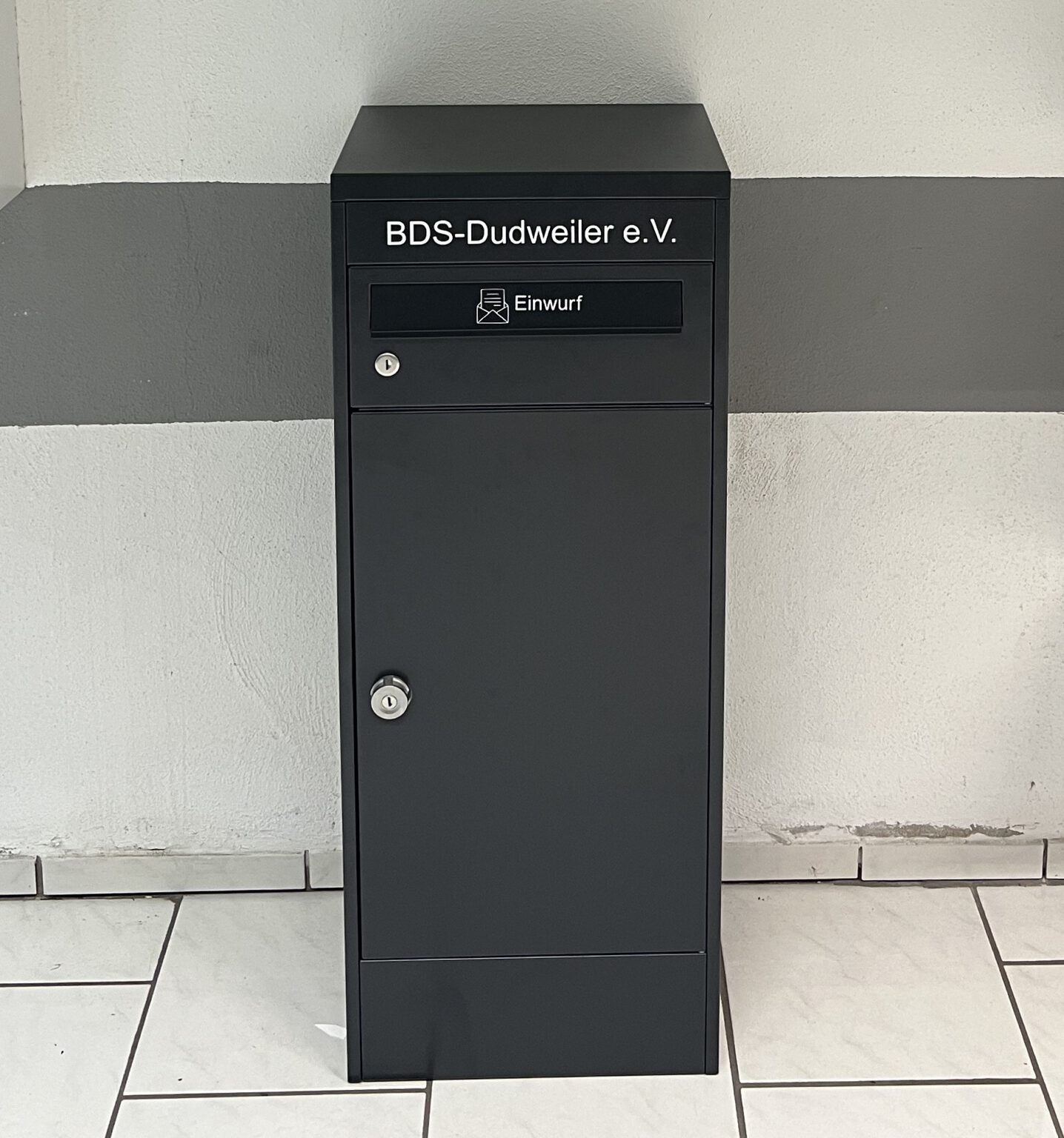 Die vollständigen Unterlagen könnt ihr im Schützenhaus  der Dudweiler Schützengesellschaft 1857 e.V. in unseren Briefkasten werfen. Dieser wird regelmäßig geleert und die Unterlagen  anschließend bearbeitet. Auf dem nachfolgenden Bild ist der zuvor genannte Briefkasten abgebildet.